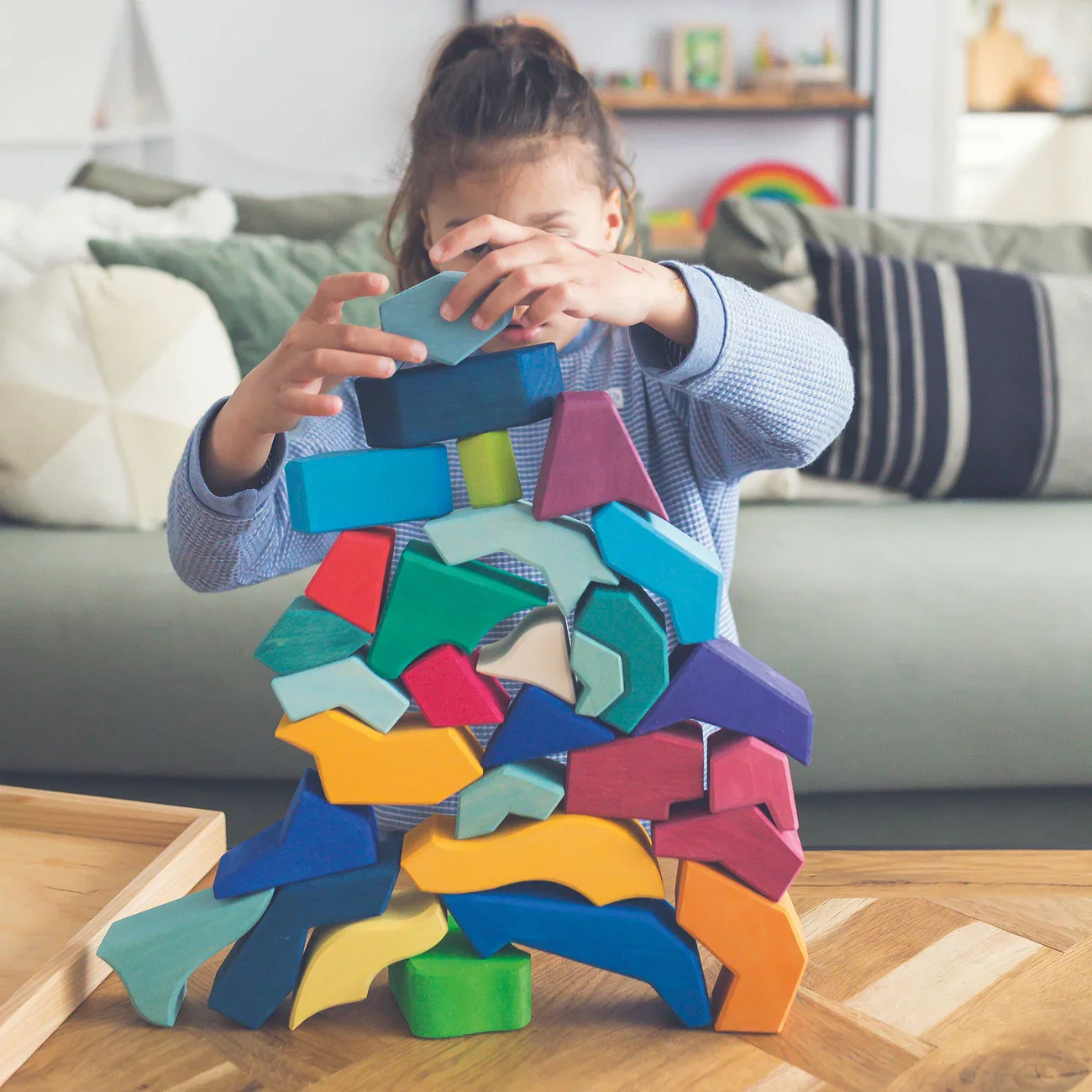 De vier temperamenten in onszelf We hebben de vier temperamenten vertaald in een taal van vormen en kleuren. Het resultaat is een kleurrijk bouwpakket met 61 vrijgevormde bouwelementen. De individuele bouwstenen doen denken aan dieren en een grote verscheidenheid aan andere wezens, en door verschillende elementen te combineren ontstaat er voortdurend iets nieuws dat de verbeelding stimuleert en inspireert. Het overheersende temperament bepaalt de specifieke stemming waarin je je het grootste deel van de tijd bevindt. Het illustreert hoe je je voelt en ervaart, denkt en handelt of reageert. Het melancholische temperament heeft een meelevende, eerder verdrietige aard. Het is BLAUW, naar binnen gekeerd, de diepte in, met randen, rondingen en volharding – net als het element Aarde. Het cholerische temperament heeft actieve en eerder boze trekken. Het is ROOD, grillig en soms scherp. De impulsiviteit hoort bij het element Vuur. Het flegmatische temperament heeft iets standvastigs en comfortabels. Het is GROEN en kalm als een vijver. De rondingen en zachte vormen corresponderen met het element Water. Het sanguinische temperament straalt vrolijkheid en optimisme uit. Het is geel en straalt van binnenuit, verliest zich in de periferie of in de lucht. Het element is luchtigheid. Door een speelse benadering van de karakteristieke eigenschappen van de temperamenten kan een gevoel voor hun essentie worden ontwikkeld. En elk mens is een unieke mix van alle vier temperamenten. 61 bouwstenen in een houten lijst. Hout: Lindehout, kleurgeglazuurd, lijst geolied. Afmetingen: Lengte houten lijst 44,5 cm, individuele delen 4 cm dik.