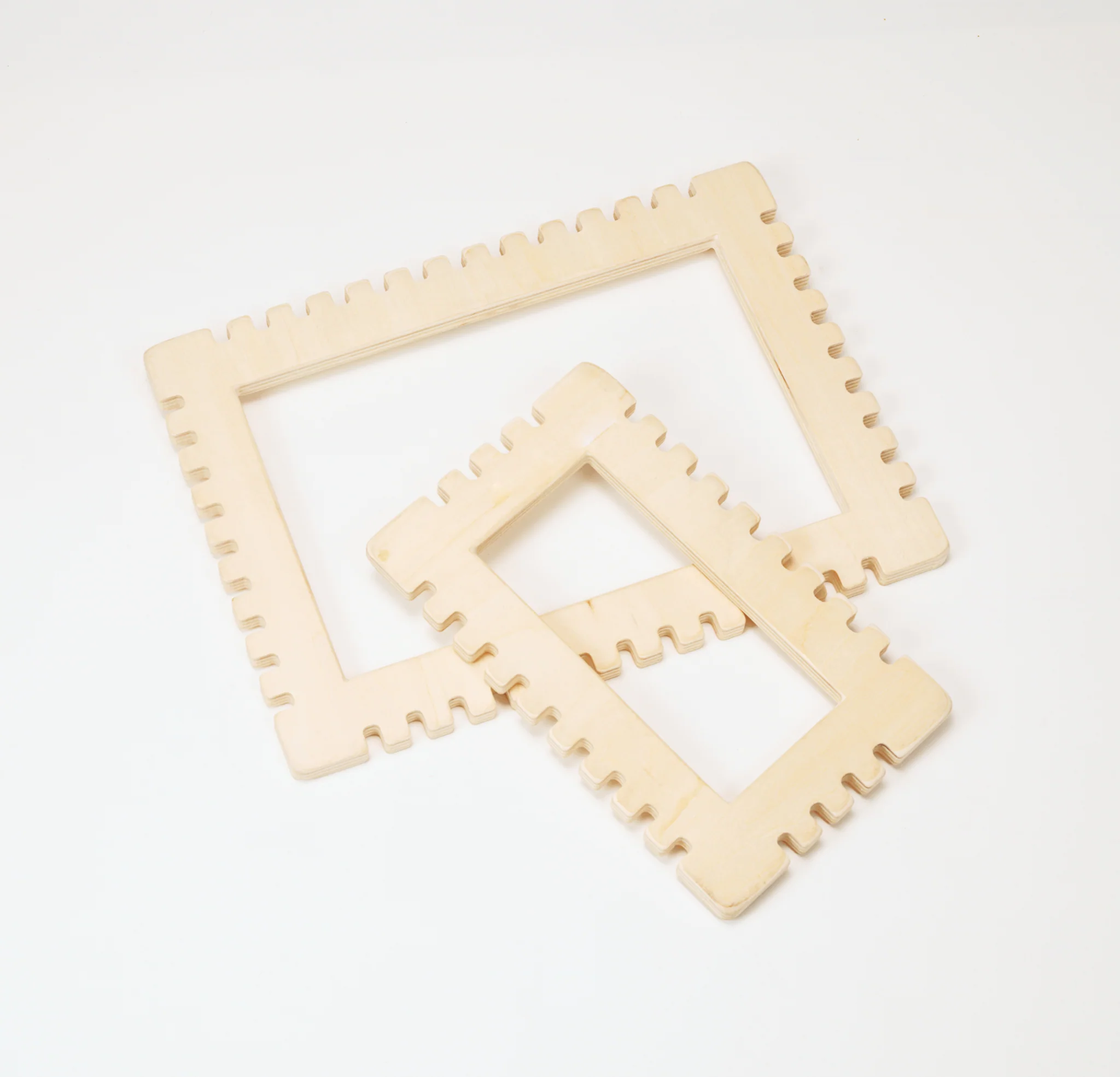 Deze eenvoudige, ingekeperde rechthoekige frames zijn een veelzijdig weefmiddel. Voeg eenvoudig een verscheidenheid aan wol, veters, linten of touw toe om mini-tapijten van kleur en textuur te creëren. Een leuke manier voor kinderen om hun fijne motoriek te oefenen, de frames kunnen worden gecombineerd met natuurlijke materialen om hun collecties weer te geven of voorbijgaande kunst te maken. Elke set is gemaakt van FSC-gecertificeerd berkenmultiplex en bevat twee frames en is veilig voor gebruik met kinderen van 18 m+. Externe frameafmetingen: 255 x 184 mm, 186 x 116 mm