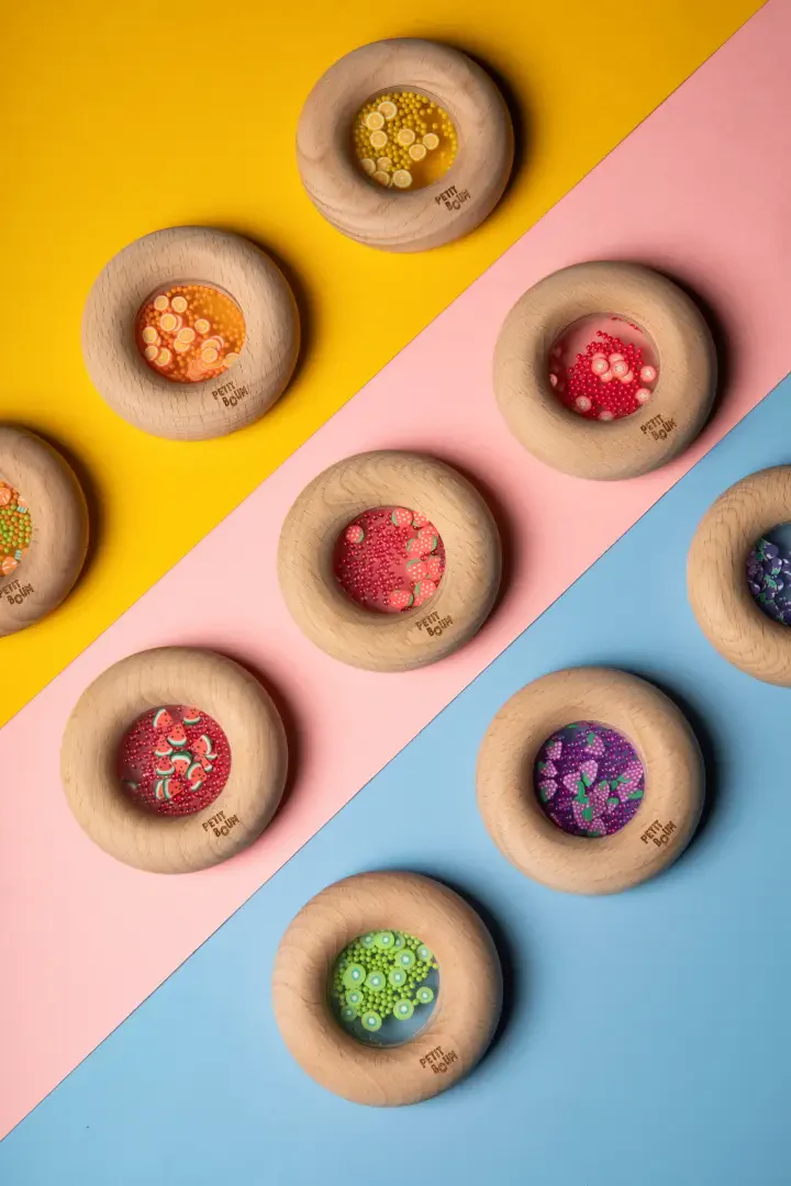 Ons nieuwe zintuiglijke speeltje zal de zoetekauw kleintjes bekoren. Het is een houten rammelaar in de vorm van een donut, ideaal voor het comfortabel hanteren van je handen. Binnenin kun je fruit- en groentefiguren herkennen, die bij het schudden het onweerstaanbare merkgeluid van het huis ontketenen. Hoewel je er zin in hebt om het op te eten, is het gemaakt van natuurlijk beukenhout, vrij van gifstoffen en bijtvast.